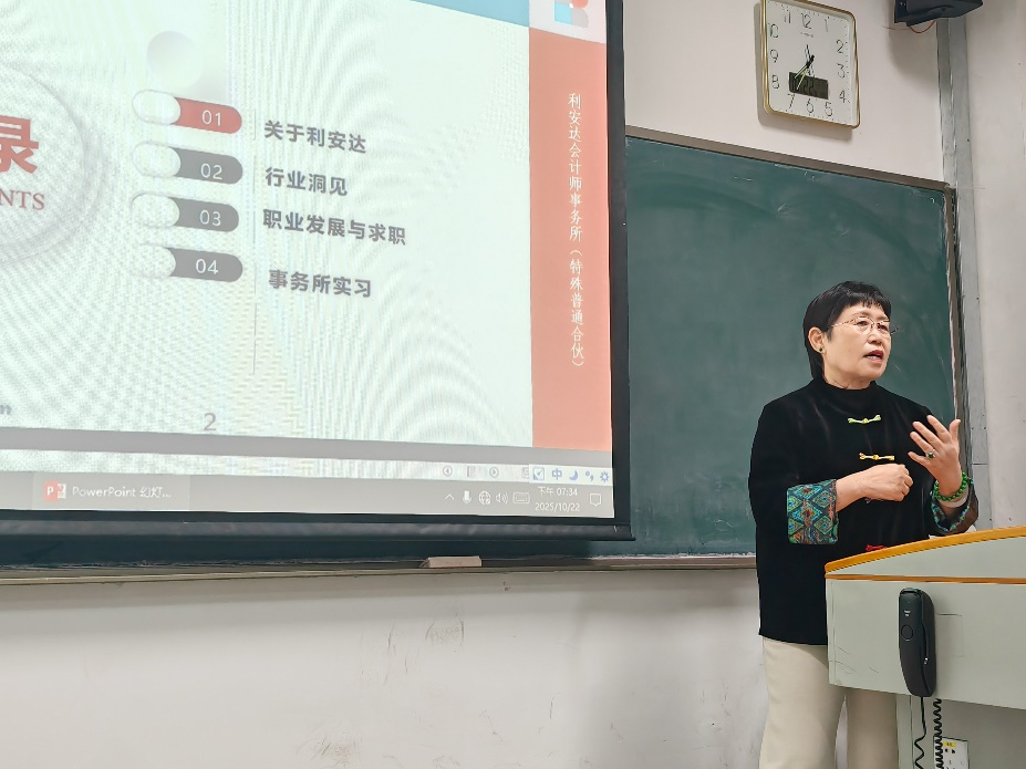 10月22日,作为新生专业导论课的一部分,学院邀请财经资深专家辛锋女士开展职业发展导航讲座,为学院大一的同学们带来了一场精彩的职业规划指导。辛锋女士为中国注协会计师资深会员、会计师、经济师,利安达会计师事务所(特殊普通合伙)创始合伙人、监事长,利安达国际财税培训中心副总裁,北注协行业发展战略委员会委员、北京市涉案企业合规第三方监督评估机制专家库首批专业人员、原北注协行业高新技术专业委员会委员。