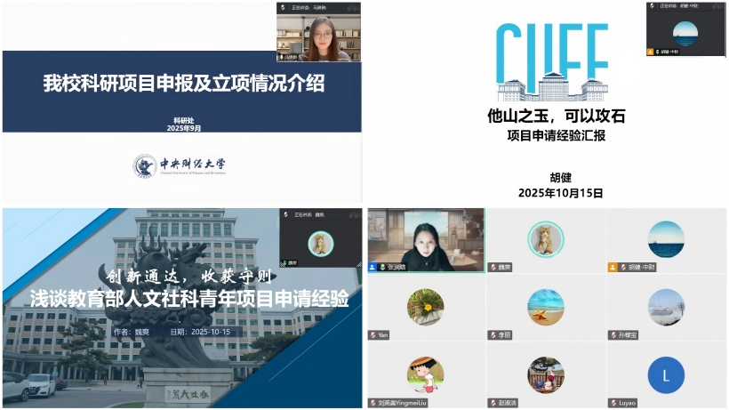 2025年10月15日晚18:00,为积极推动学院科研课题申报工作,扎实推进有组织科研,学院于线上举办“leyu(中国)科研课题申报交流活动暨2026年课题申报启动会”。本次活动邀请到我校科研处项目科马琳琳老师、学院今年获批教育部人文社科青年基金项目的胡健老师和魏爽老师与大家就课题申请经验进行交流与分享。会议由leyu(中国)副院长张润晗主持,学院十余名教师参加了此次活动。