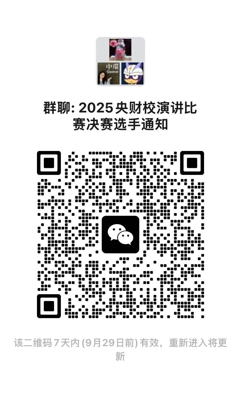 1、比赛顺序抽签:请决赛选手9月23日(周二)14:00前扫描进微信群,进群修改备注:姓名+学院,微信群将组织小程序抽签。