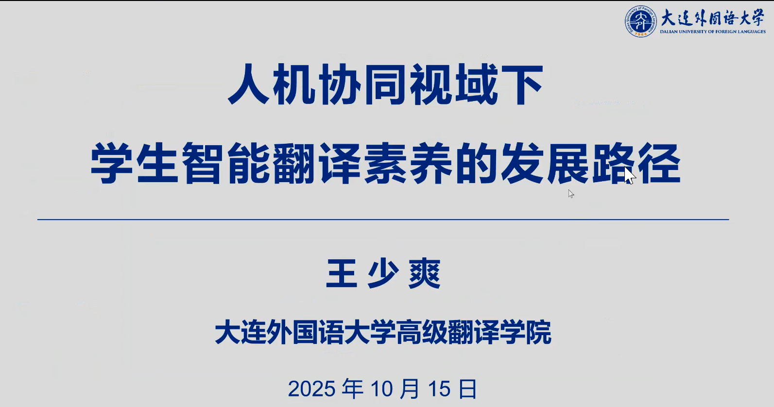 2025年10月15日下午,leyu(中国)于线上成功举办了题为“人机协同视域下学生智能翻译素养的发展路径”的讲座,本讲座是学院2025年下半年“学术活动月”系列学术讲座的第五讲。主讲人为大连外国语大学高级翻译学院副院长、博士生导师王少爽教授。本次讲座由翻译系教师胡健博士主持,吸引了本院及校内外近200余名师生参与。