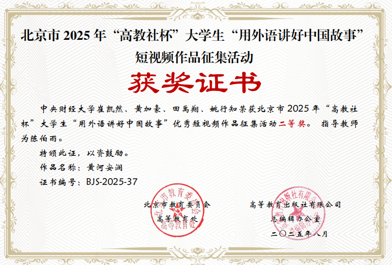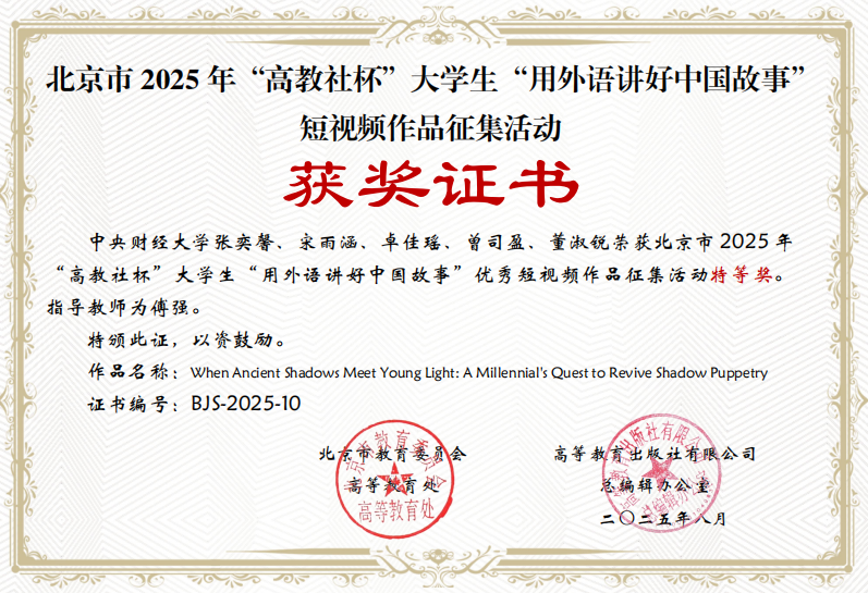 北京市2025年大学生“用外语讲好中国故事”优秀短视频作品征集活动于5月进行校级评审,7月开展北京市级遴选,9月进行现场交流活动。本次优秀短视频作品征集活动以“新时代·新变化——时潮奔涌,青春不凡”为主题,我校选送的短视频作品《When Ancient Shadows Meet Young Light: A Millennial's Quest to Revive Shadow Puppetry》(作者:张奕馨等)在北京市级遴选中荣获特等奖; 《黄河安澜》(作者:崔凯然等)在北京市级遴选中荣获二等奖。